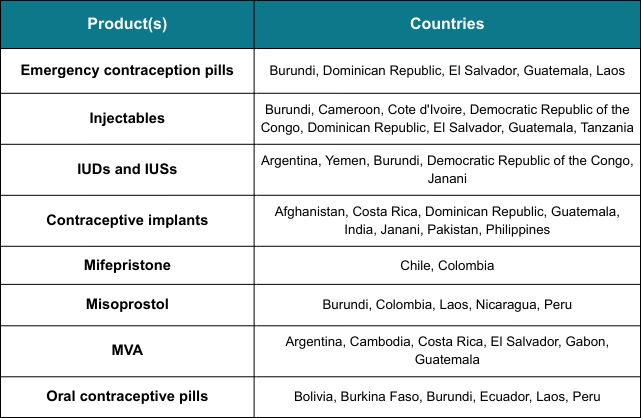 - We’ve launched new contraceptive and safe abortion products in 34 countries, from Myanmar to Mozambique.